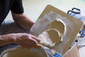 まずは使用する材料を練り、均一な状態にします。漆喰やモルタル、珪藻土などを使用する場合でも、しっかりと混ぜ合わせることで施工品質が安定します。
